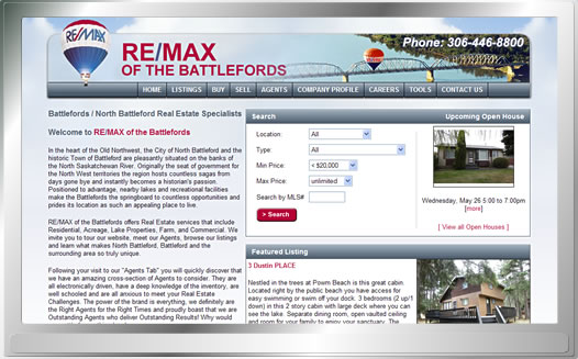 This bright and friendly design represents a wealth of information in an attractive local format for website visitors. New listings are automatically added to the site by B2B transfer of data from MLS. Private listings can be inserted by Re/Max staff through a simple web-based management system developed by M.R. Website.